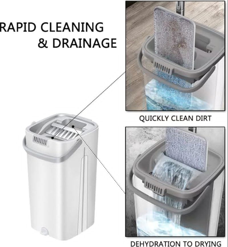 Just insert the mop into the dual-action bucket — one side WASHES, the other side DRIES. No wet hands. No back pain. No wahala.